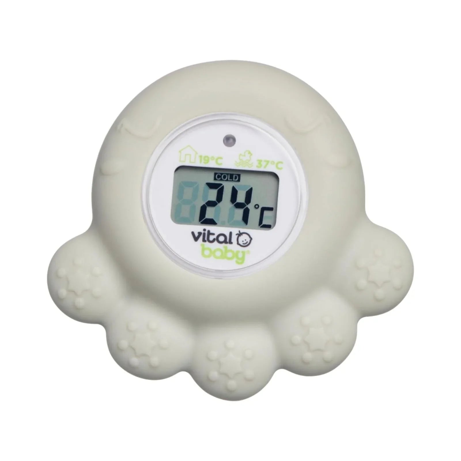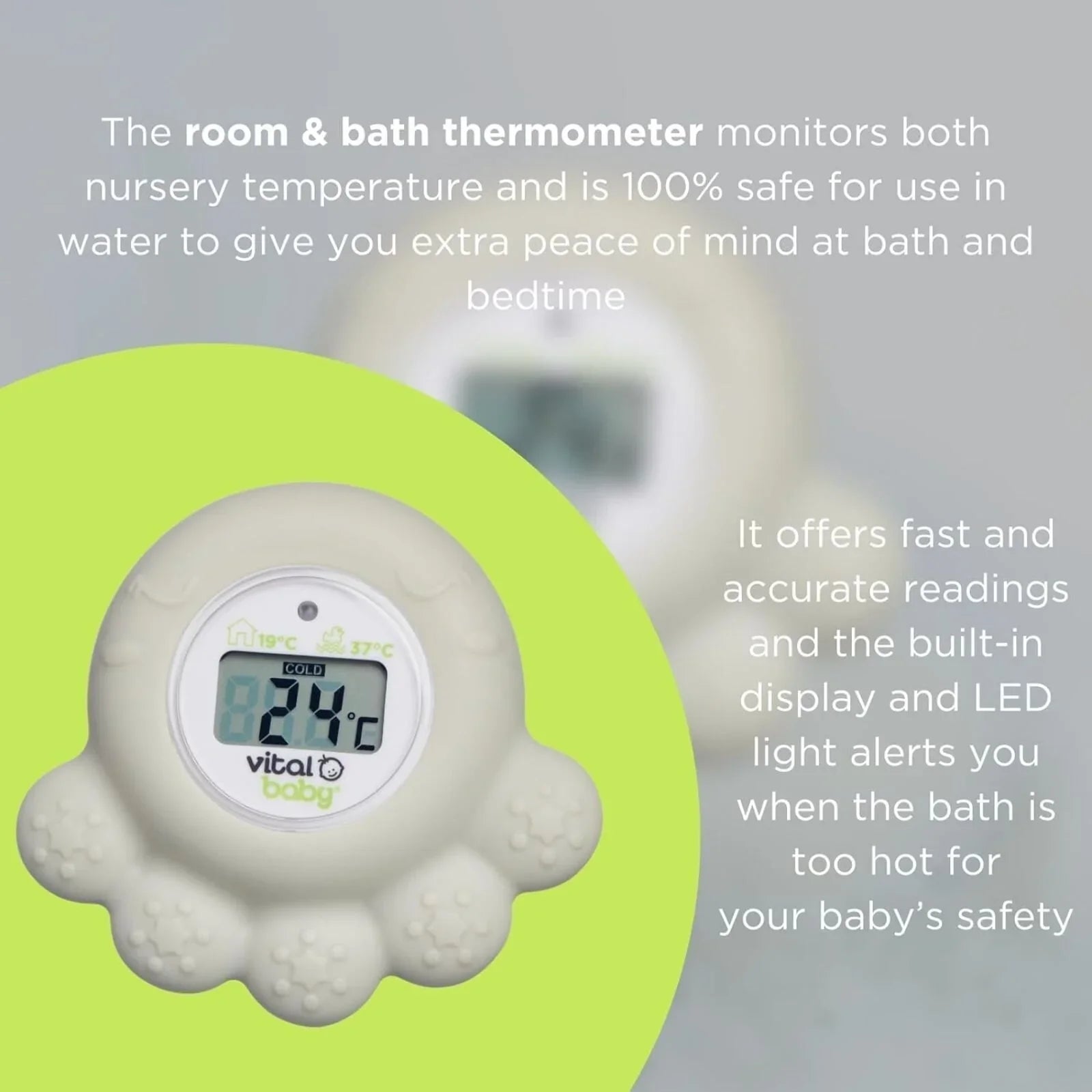 Bath and nursery thermometer with built-in display and LED warning light.