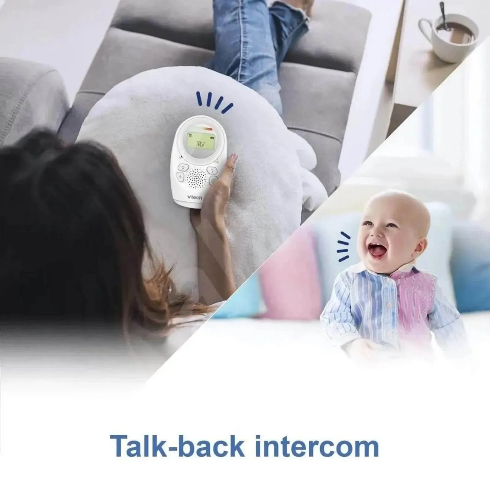 Know how your little one is doing during naptime with the VTech DM1212 Audio Baby Monitor with up to 300 meters of Range, Vibrating Sound-Alert, Talk-Back Intercom & Night Light Projector. Soft light shines through the top of the baby unit on this audio monitor, projecting a starry night scene onto the ceiling.
