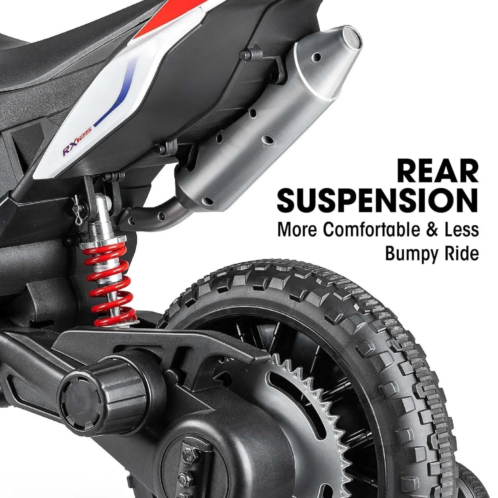 • It is a 12V battery-powered electric ride-on motorbike with an officially licensed Aprilia design.